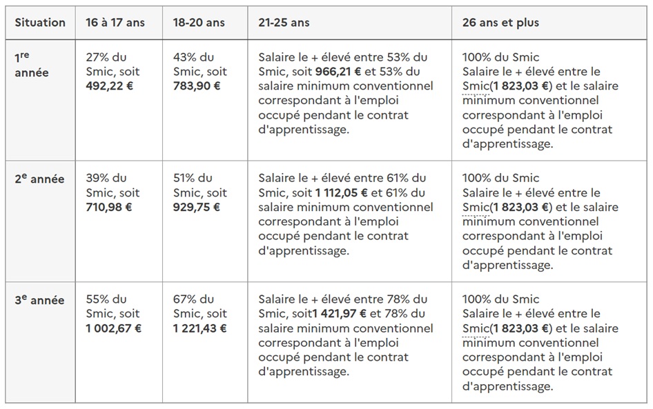 Un apprenti de 21 ans en 2e année de contrat est rémunéré à 61 % du SMIC, soit environ 1 110 euros bruts.